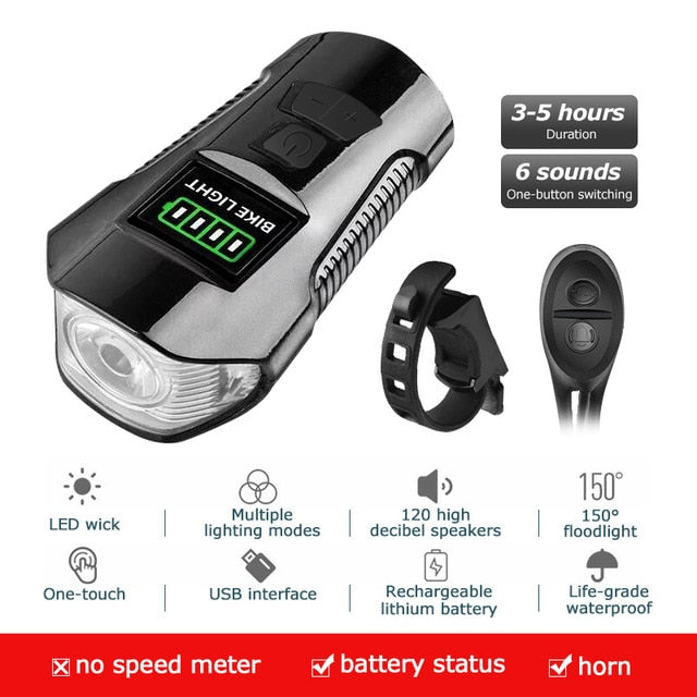 Waterproof Bicycle Light USB Charging Bike Front Light Flashlight Handlebar Cycling Head Light w/ Horn Speed Meter LCD Screen